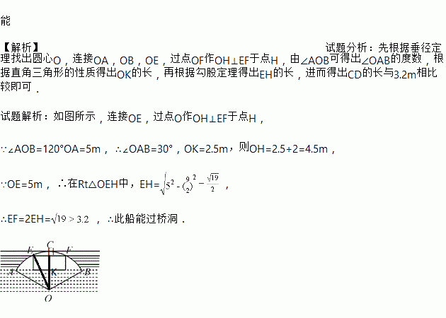 如图,一拱桥所在弧所对的圆心角为120°(即∠AOB=120°),半径为5 m,一艘6 m宽的船装载一集装箱,已知箱顶宽3.2 m,离水面AB高2 m,问此船能过桥洞吗?请说明理由.