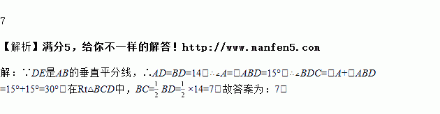 如图,Rt△ABC中,∠ACB=90°,∠A=15°,AB的垂直平分线与AC交于点D,与AB交于点E,连接BD.若AD=14,则BC的长为_____.