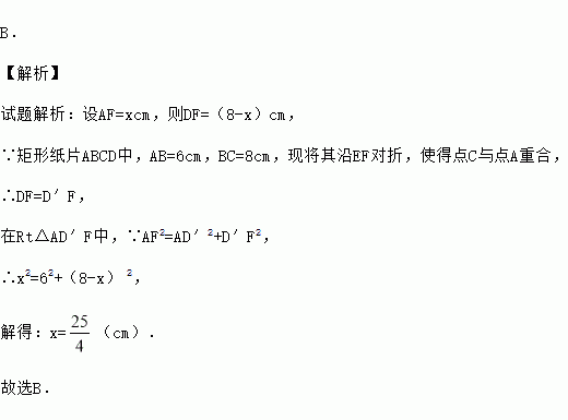 如图所示,矩形纸片ABCD中,AB=6cm,BC=8cm,现将其沿EF对折,使得点C与点A重合,则AF长为( )