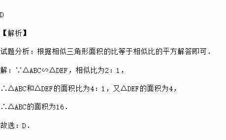 D 【解析】 试题分析:根据相似三角形面积的比等于相似比的平方解答即可. 【解析】 ∵△ABC∽△DEF,相似比为2:1, ∴△ABC和△DEF的面积比为4:1,又△DEF的面积为4, ∴△ABC的面积为16. 故选:D.