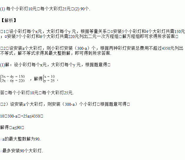 (2)若场地共需安装小彩灯和大彩灯300个,费用不超过4350元,则最多安装大彩灯多少个?
