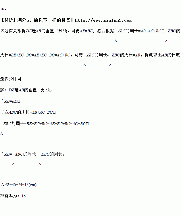 (3分)如图,△ABC中,AB=AC,AB的垂直平分线交边AB于D点,交边AC于E点,若△ABC与△EBC的周长分别是40cm,24cm,则AB= cm.