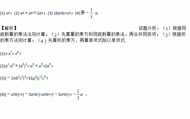 (1) x8;(2) a6+a6=2a6;(3) 16a4b12c8;(4)原-a. 【解析】试题分析:(1)根据同底数幂的乘法法则计算;(2)先算幂的乘方和同底数幂的乘法,再合并同类项;(3)根据积的乘方法则计算;(4)先算积的乘方,再算单项式除以单项式. (1)x·x7= x8; (2)a2·a4+(a3)2= a6+a6=2a6; (3)(-2ab3c2)4=16a4...