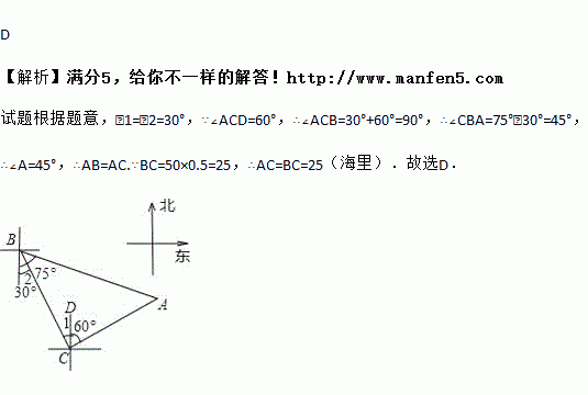轮船从B处以每小时50海里的速度沿南偏东30°方向匀速航行,在B处观测灯塔A位于南偏东75°方向上,轮船航行半小时到达C处,在C处观测灯塔A位于北偏东60°方向上,则C处与灯塔A的距离是( )海里.