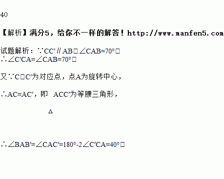 如图,在△ABC中,∠CAB=70°. 在同一平面内,现将△ABC绕点A旋转,使得点B落在点B’,点C落在点C’,如果CC’//AB,那么∠BAB’ = ________°.
