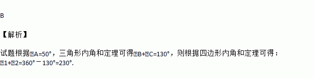 如图,△ABC中,∠A=50°,点D,E分别在AB,AC上,则∠1+∠2的大小为( )