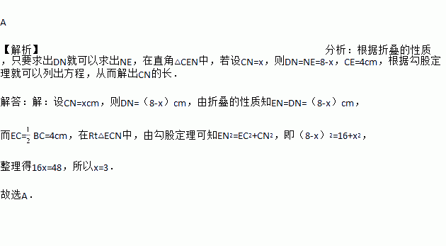 如图,将边长为8㎝的正方形ABCD折叠,使点D落在BC边的中点E处,点A落在F处,折痕为MN,则线段CN的长是( )