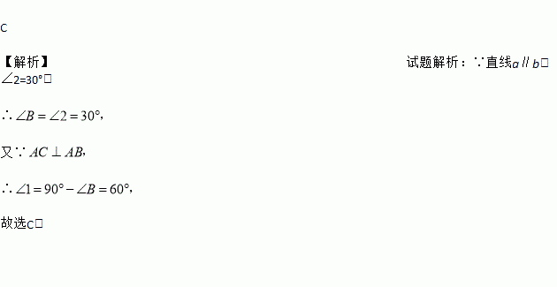 如图,直线a∥b,AC⊥AB,AC与直线a,b分别相交于A,C,若∠2=30°,则∠1的度数为( )