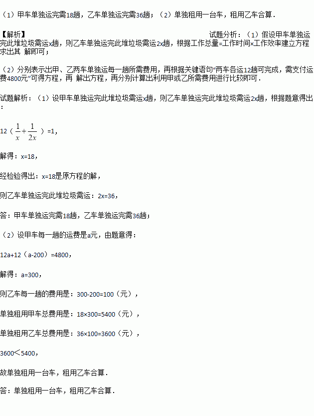 (1)求甲、乙两车单独运完此堆垃圾各需运多少趟?