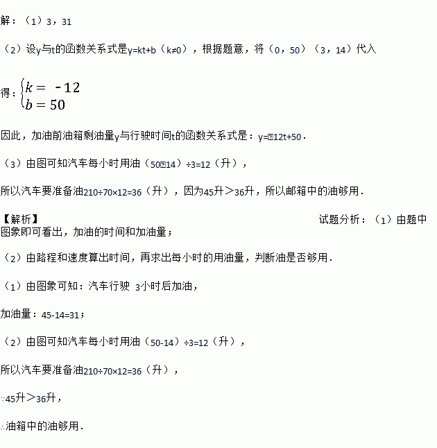 (3)已知加油前、后汽车都以70千米/小时匀速行驶,如果加油站距目的地210千米,要到达目的地,问油箱中的油是否够用?请说明理由.