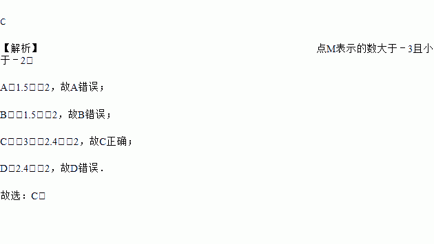 C 【解析】点M表示的数大于﹣3且小于﹣2, A、1.5>﹣2,故A错误; B、﹣1.5>﹣2,故B错误; C、﹣3<﹣2.4<﹣2,故C正确; D、2.4>﹣2,故D错误. 故选:C.