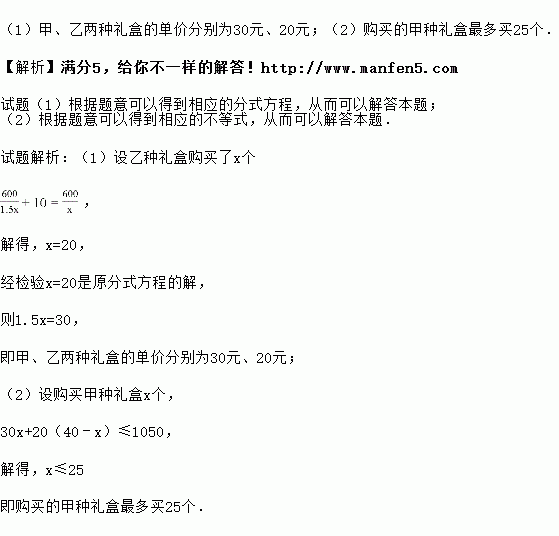 (2)若商家计划购买这两种礼盒共40个,且投入的经费不超过1050元,则购买的甲种礼盒最多买多少个?
