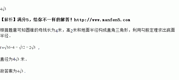一顶简易的圆锥形帐蓬,帐篷收起来时伞面的长度有米,撑开后帐篷高米,则帐篷撑好后的底面直径是________米.
