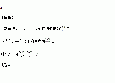 小明家离学校2000米,小明平时从家到学校需要用x分钟,今天起床晚,恰迟到,走路速度比平时快5米分钟,结果比平时少用了2分钟到达学校,则根据题意可列方程![]()