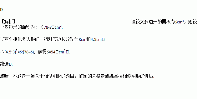 两个相似多边形的一组对分别是3cm和4.5cm,如果它们的面积之和是,那么较大的多边形的面积是( )