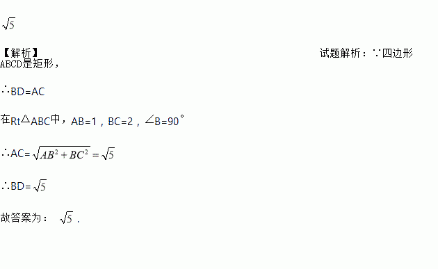 在矩形ABCD中,AB=1,BC=2,则BD=_______.