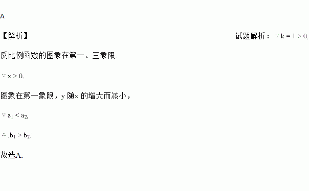 若A(a1,b1),B(a2,b2)是反比例函数y=(x>0)图象上的两个点,且a1<a2,则b1与b2的大小关系是( )
