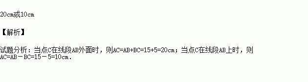 已知A、B、C三点在一条直线上,且线段AB=15cm,BC=5cm,则线段AC=______ .