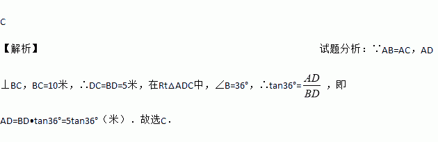 C 【解析】试题分析:∵AB=AC,AD⊥BC,BC=10米,∴DC=BD=5米,在Rt△ADC中,∠B=36°,∴tan36°=,即AD=BD•tan36°=5tan36°(米).故选C.