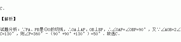 (3分)如图,PA、PB分别与⊙O相切于A、B两点,若∠C=65°,则∠P的度数为( )