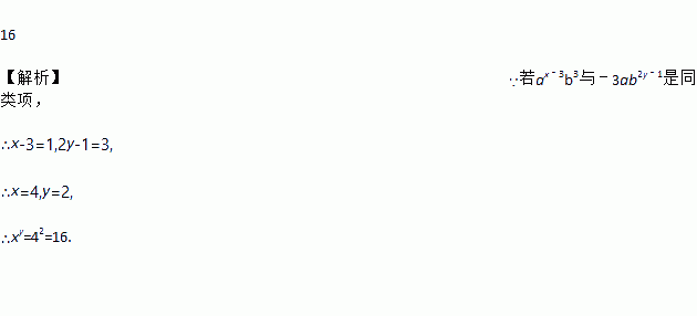 16 【解析】∵若ax﹣3b3与﹣3ab2y﹣1是同类项, ∴x-3=1,2y-1=3, ∴x=4,y=2, ∴xy=42=16.