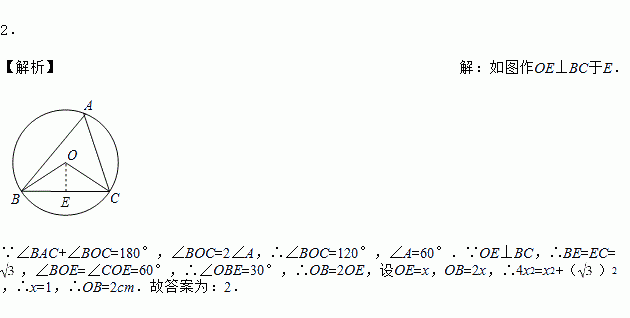 如图,△ABC是⊙O的内接三角形,连接OB、OC,若∠BAC+∠BOC=180°,BC=2cm,则⊙O的半径为______cm.