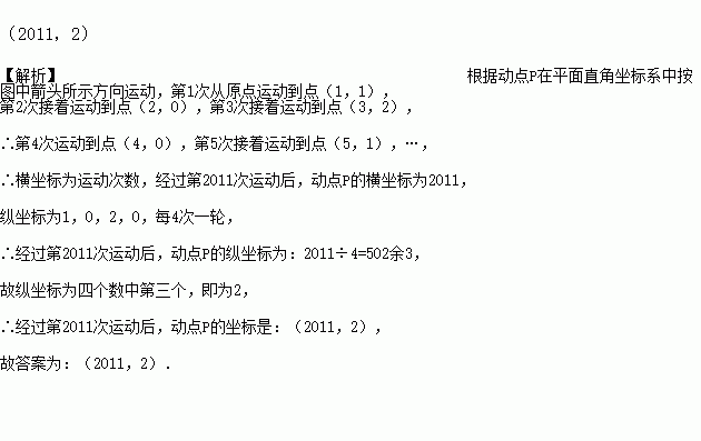 如图,动点P在平面直角坐标系中按图中箭头所示方向运动,第1次从原点运动到点(1,1),第2次接着运动到点(2,0),第3次接着运动到点(3,2),…,按这样的运动规律,经过第2011次运动后,动点P的坐标是____________。