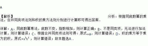A. a2•a4=a6 B. a2+a5=a7 C. 3a﹣2a=1 D. (ab)3=ab3