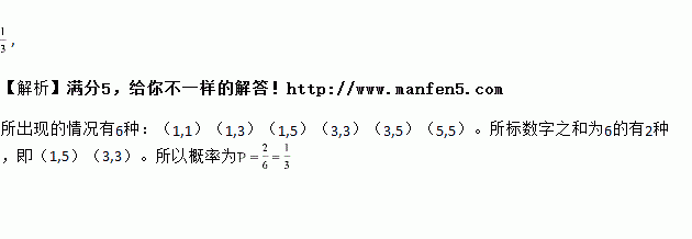 一个不透明的袋子中装有3个小球,它们除分别标有的数字1,3,5不同外,其他完全相同。任意从袋子中摸出一球后放回,在任意摸出一球,则两次摸出的球所标数字之和为6的概率是