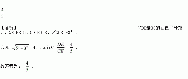 如图,△ABC中,DE是BC的垂直平分线,DE交AC于点E,连接BE,若BE=5,BC=6,则sinC=___.
