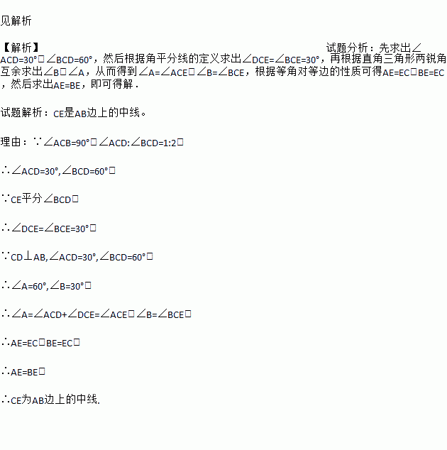 已知:如图,在△ABC中,∠ACB=90°,CD为高,CE平分∠BCD,且∠ACD:∠BCD=1:2,那么CE是AB边上的中线对吗?说明理由.