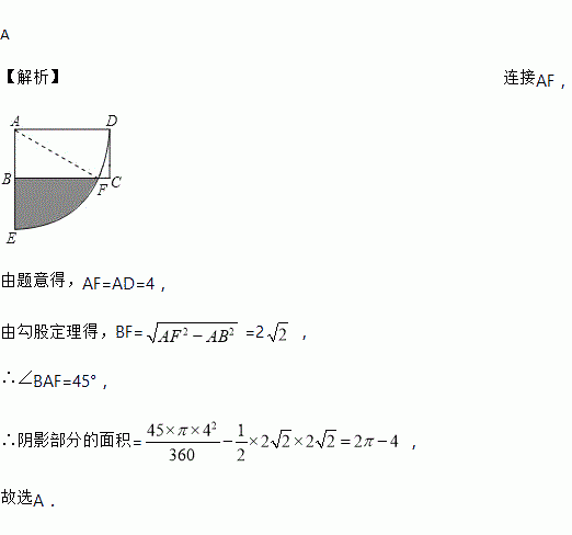 如图,矩形ABCD,以A为圆心,AD为半径作弧交BC于点F,交AB的延长线于点E,已知 AD=4,AB=2,则阴影部分的面积为( )