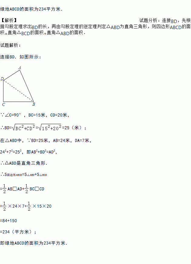 如图,是一块四边形绿地的示意图,其中AB长为24米,BC长15米,CD长为20米,DA长7米,∠C=90°,求绿地ABCD的面积.