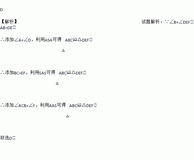 D 【解析】试题解析:∵∠B=∠DEF,AB=DE, ∴添加∠A=∠D,利用ASA可得△ABC≌△DEF; ∴添加BC=EF,利用SAS可得△ABC≌△DEF; ∴添加∠ACB=∠F,利用AAS可得△ABC≌△DEF; 故选D.