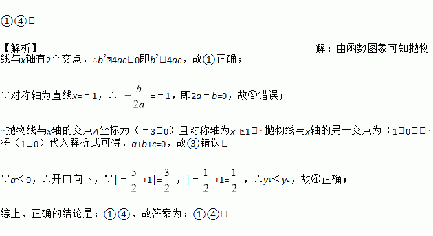 如图是二次函数y=ax2+bx+c图象的一部分,图象过点A(-3,0),对称轴为直线x=-1,给出四个结论:①b2>4ac;②2a+b=0;③a+b+c>0;④若点B(-