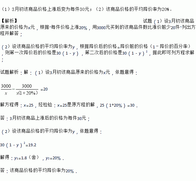 3 月初某商品价格上涨,每件价格上涨 20%.用 3000 元买到的该商品 件数比涨价前少 20 件.3 月下旬该商品开始降价,经过两次降价后,该商品价格为每 件 19.2 元.