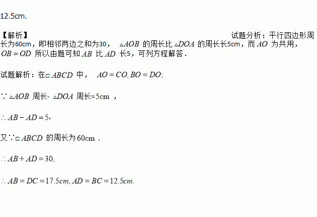 已知:□的周长为,对角线、相交于点, 的周长比的周长长,求这个平行四边形各边的长.