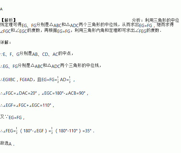 如图,四边形 ABCD 中,AD=BC,E、F、G 分别是 AB、CD、AC 的中点,若∠DAC=20 º,∠ACB=90 º,则 ∠FEG=( )
