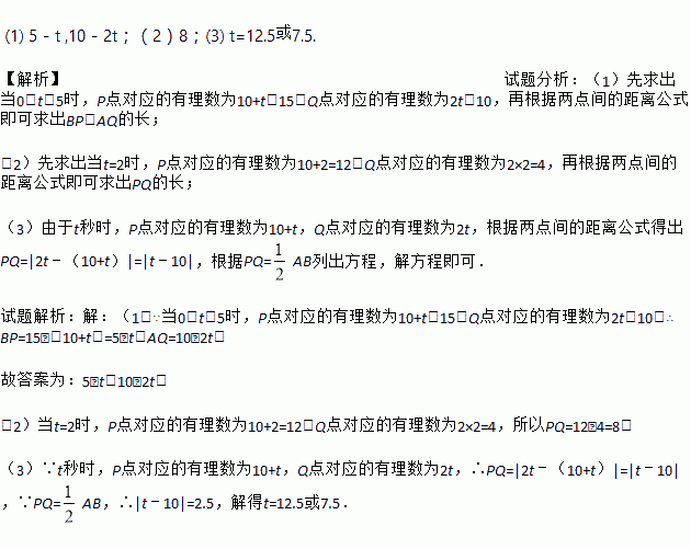 如图,数轴上A,B两点对应的有理数分别为10和15,点P从点A出发,以每秒1个单位长度的速度沿数轴正方向运动,点Q同时从原点O出发,以每秒2个单位长度的速度沿数轴正方向运动,设运动时间为t秒.