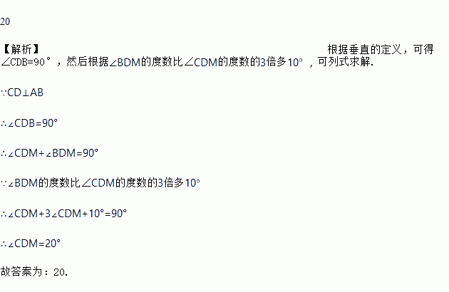 如图,CD⊥AB于点D,过点D引射线DM,∠BDM的度数比∠CDM的度数的3倍多10,则∠CDM=_____.