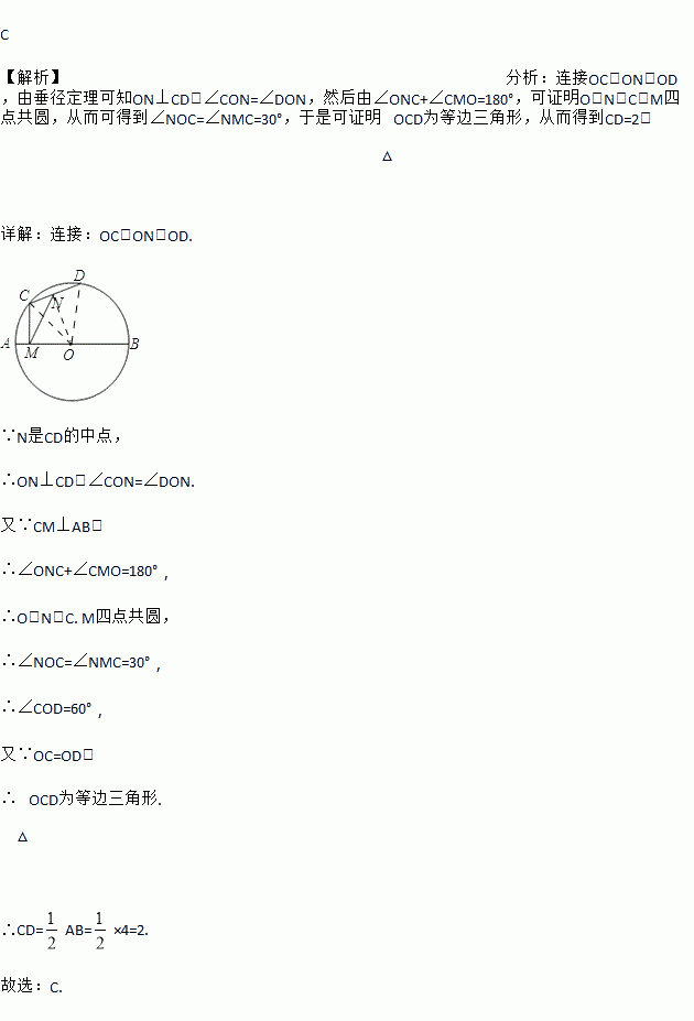 如图,AB为直径,AB=4,C、D为圆上两个动点,N为CD中点,CM⊥AB于M,当C、D在圆上运动时保持∠CMN=30°,则CD的长( )