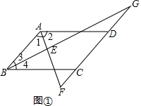 如图①、②在?ABCD中,∠BAD、∠ABC的平分线AF、BG分别与线段CD两侧的延长线(或线段CD)相交于点F、G,AF与BG相交于点E.