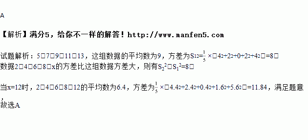 若一组数据2、4、6、8、x的方差比另一组数据5、7、9、11、13的方差大,则x的值可以为( )