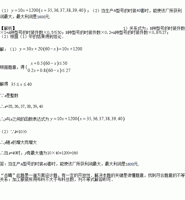 已知某服装厂现有甲种布料50米,乙种布料27米,现计划用这两种布料生产A,B两种型号的时装共60套. 已知做一套A型号的时装需用甲种布料1米,乙种布料0.2米,可获利30元;做一套B型号的时装需用甲种布料0.5米,乙种布料0.8米,可获利20元. 设生产A型号的时装套数为x,用这批布料生产两种型号的时装所获得的总利润为y元.