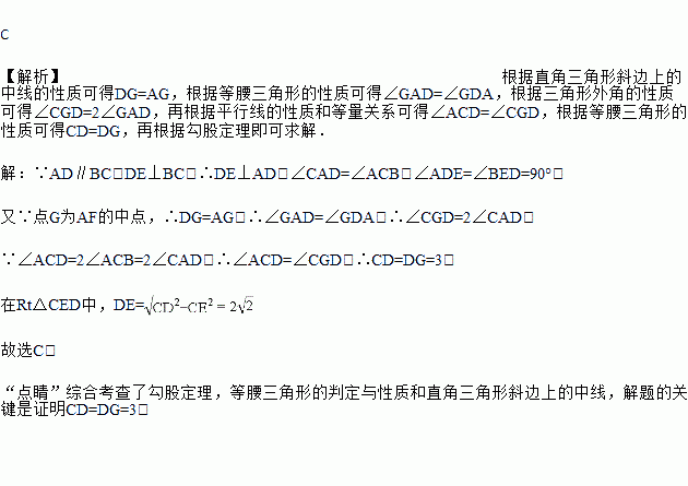如图,在四边形ABCD中,AD∥BC,DE⊥BC,垂足为点E,连接AC交DE于点F,点G为AF的中点,∠ACD=2∠ACB.若DG=3,EC=1,则DE的长为( )![]()