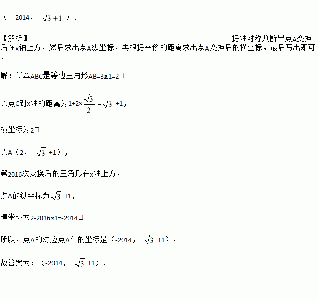 (2016黑龙江省龙东地区)如图,等边三角形的顶点A(1,1)、B(3,1),规定把等边△ABC“先沿x轴翻折,再向左平移1个单位”为一次変换,如果这样连续经过2016次变换后,等边△ABC的顶点C的坐标为________________________.