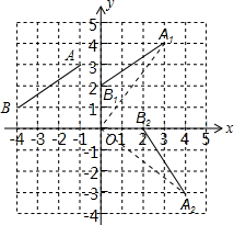 分析:(1)先在坐标系中找出点B1的位置,然后根据平移前后对应点连线平行可找到点A1的位置,连接即可得出A1B1,按照题意所属旋转三要素找到A1、B1的对应点连接可得出A2B2.