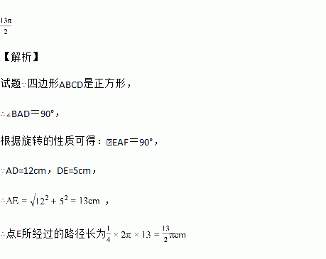 已知正方形ABCD的边长为12cm,E为CD边上一点,DE=5cm.以点A为中心,将△ADE按顺时针方向旋转得△ABF,则点E所经过的路径长为___________cm.