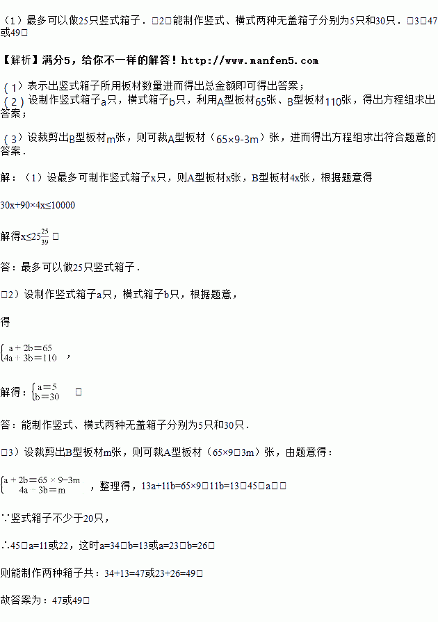 (1)若该工厂准备用不超过10000元的资金去购买A,B两种型号板材,并全部制作竖式箱子,已知A型板材每张30元,B型板材每张90元,求最多可以制作竖式箱子多少只?