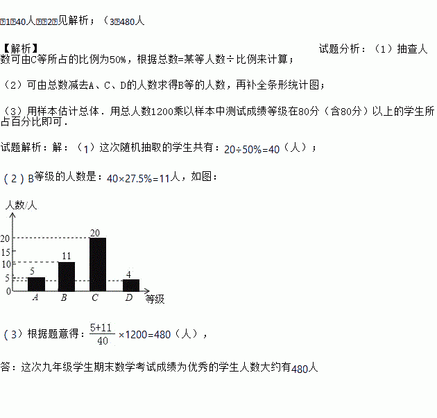 (3)这个学校九年级共有学生1200人,若分数为80分(含80分)以上为优秀,请估计这次九年级学生期末数学考试成绩为优秀的学生人数大约有多少?